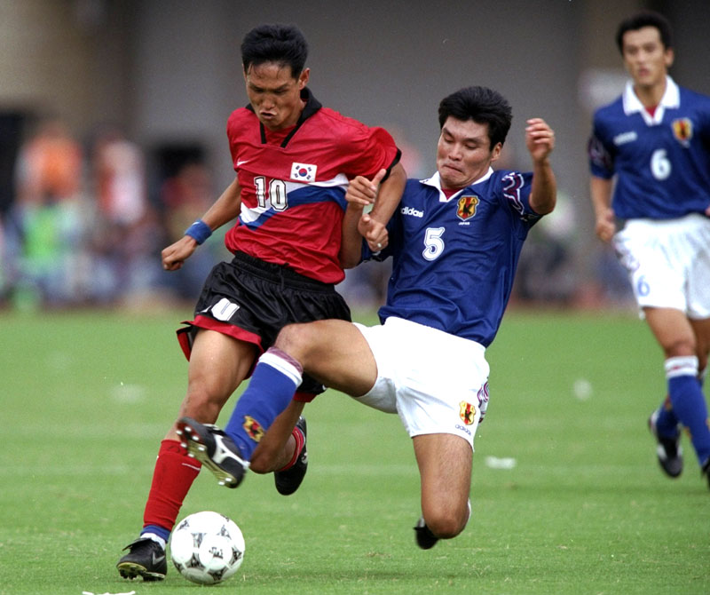 1997年9月28日に旧国立競技場で行われた1998フランスW杯予選。日本は先制に成功するも試合終盤に2失点し、ホームで逆転負けを喫した。当時のユニフォームは胸にエンブレムではなく国旗(太極旗)を装着。デザインも太極旗をモチーフにしたものだった。