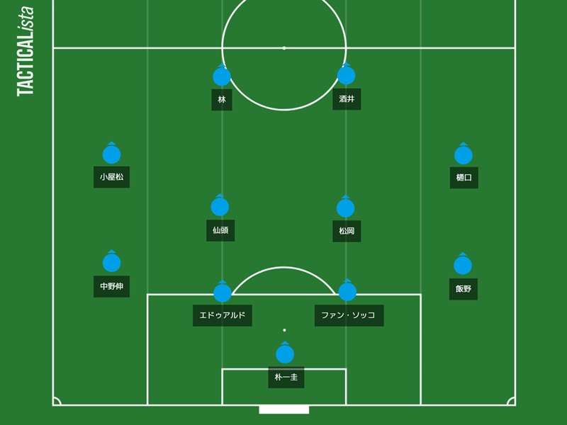 守護神は不動の存在である朴一圭で、最終ラインは右から飯野七聖、ファン・ソッコ、エドゥアルド、中野伸哉または大畑歩夢の4人。