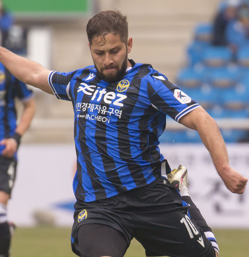 韓国Kリーグ1部の仁川(インチョン)は、エンブレムと同じ青黒ストライプをユニフォームにも使う。2004年には前園真聖氏が在籍していた。