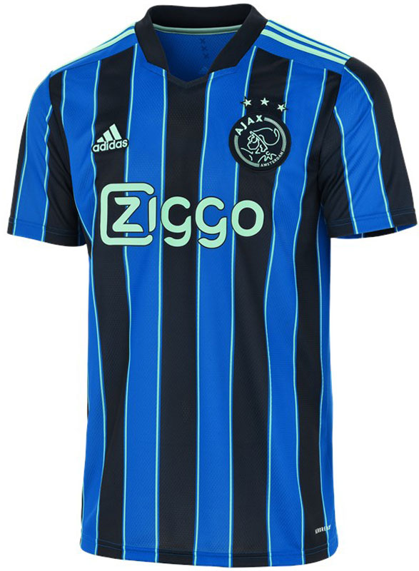 新アウェイユニフォームはブルーとダークブルーのストライプが登場。スリーストライプスやスポンサーロゴなどはミントブルーで彩る。同じくブルーを基調とした20-21シーズンのアウェイとは、別の冷たさを感じるデザインだ。胸スポンサーは「Ziggo」で継続する。