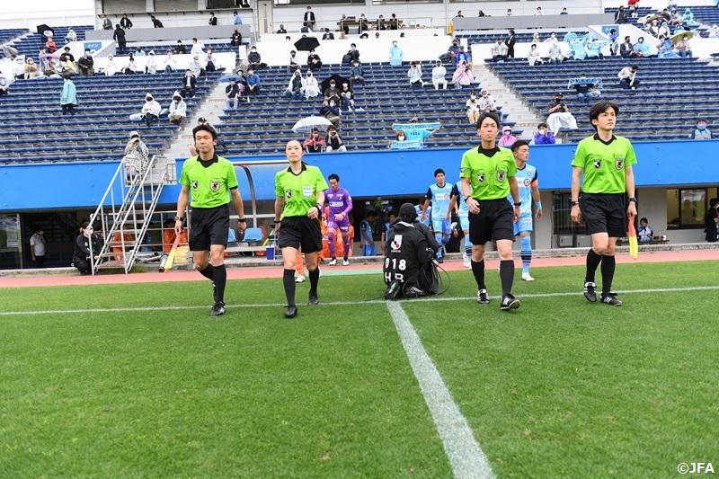記念すべき最初の扉を開いたのは山下良美主審。今シーズンからJリーグの担当審判員に名を連ねると、16日の明治安田生命J3リーグ第8節Y.S.C.C.横浜対テゲバジャーロ宮崎の主審を任され、雨も降る中でのゲームを見事に裁き切った。