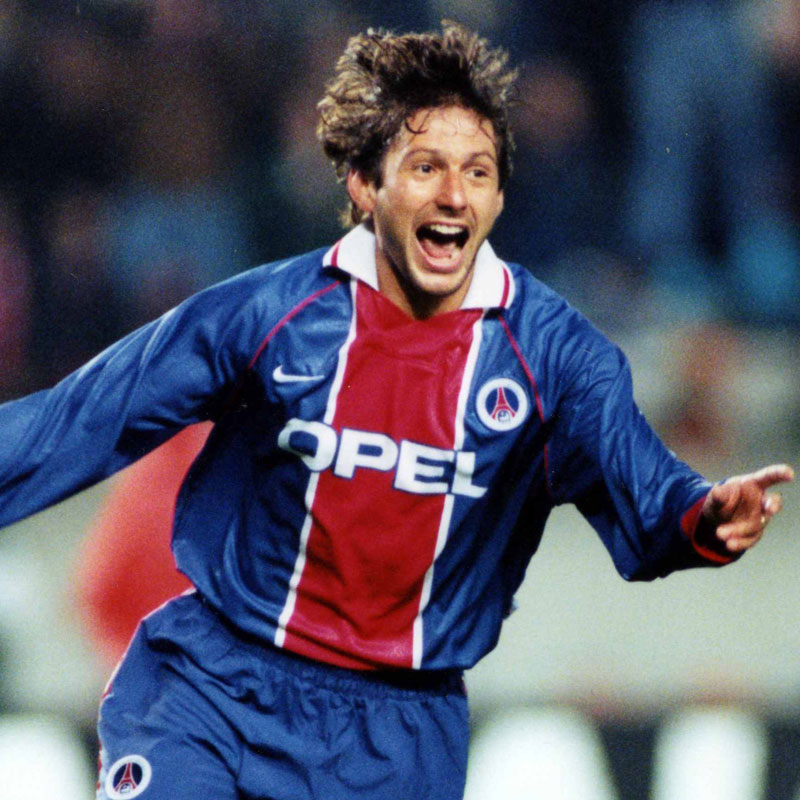 当時のホームキットは現在のようなダークネイビーではなく、明るめのブルーを基調としたデザイン。PSGのブルーとレッドは本拠地パリの旗の色。そしてホワイトはサンジェルマン地区の色である。