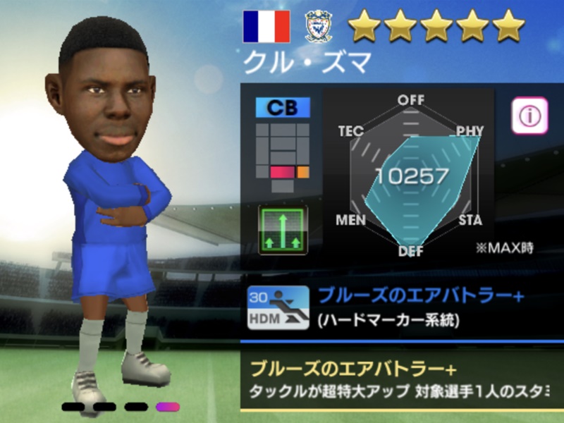 190cmという長身にして怪物的な身体能力を有し、安定度の低さが玉にキズながら、その空中戦の強さは欧州のサッカー界でも屈指といえる。ゲーム内のプレースタイルも「ブルーズのエアバトラー」となっている。