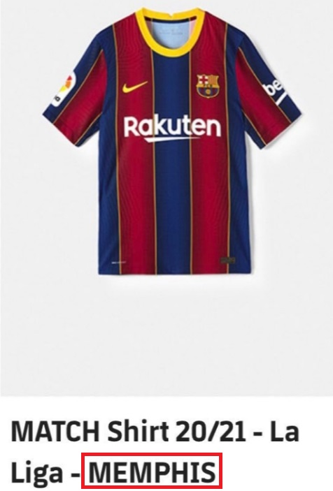これは20-21シーズンのバルサのホームユニフォーム。確かにMemphisと表示されている。