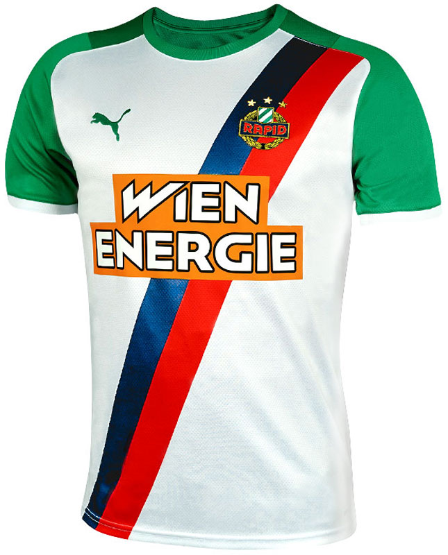 胸スポンサーはオーストリアのエネルギー関連企業「WIEN ENERGIE」で継続。ラピドのホームといえばグリーンとホワイトのボーダーというイメージが強く、今回は大胆な路線変更となった。