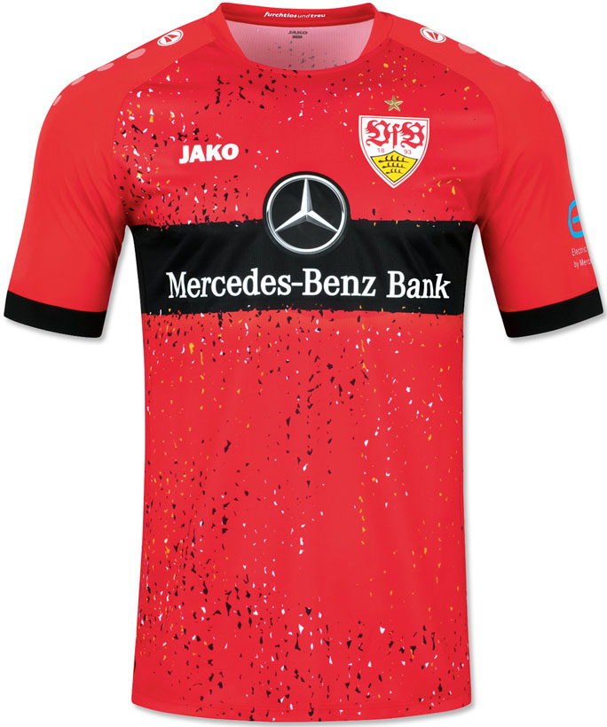 新アウェイユニフォームはベースカラーにレッドが復活。差し色にブラックを配するデザインは、ホームキットと同様に、19世紀から20世紀初めにかけてドイツ南部を統治したヴュルテンベルク王国の旗や紋章を意識したものだという。