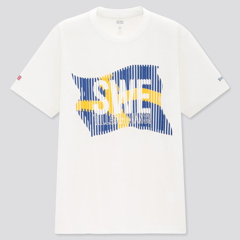 スウェーデン国旗をデザインしたグラフィックTシャツ。右袖にユニクロのロゴマーク。左袖に国名の略称(IOCコード)で「SWE」をプリントする。