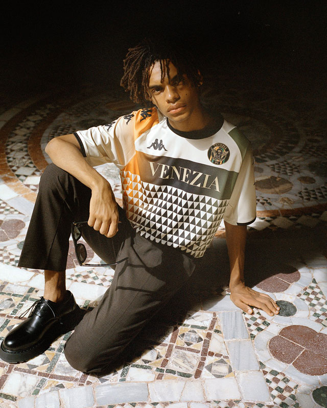 アウェイユニフォームはクリーム色を基調に、チームカラーのオレンジとグリーンを配するデザイン。細かな三角形はヴェネツィアの有名なモザイクをモチーフとしている。