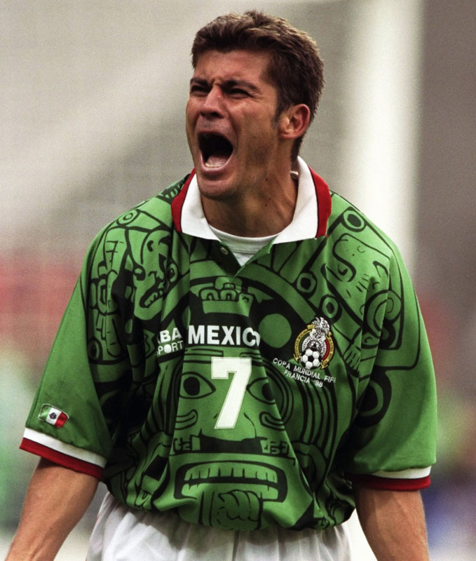 1998年フランスW杯で使われた衝撃的なユニフォーム。フィールドプレーヤーだけではなく、当時のGKホルヘ・カンポスも着用した。デザインはメキシコの遺物「太陽の石」をモチーフとしたもので、“アステカユニフォーム”とも呼ばれる。