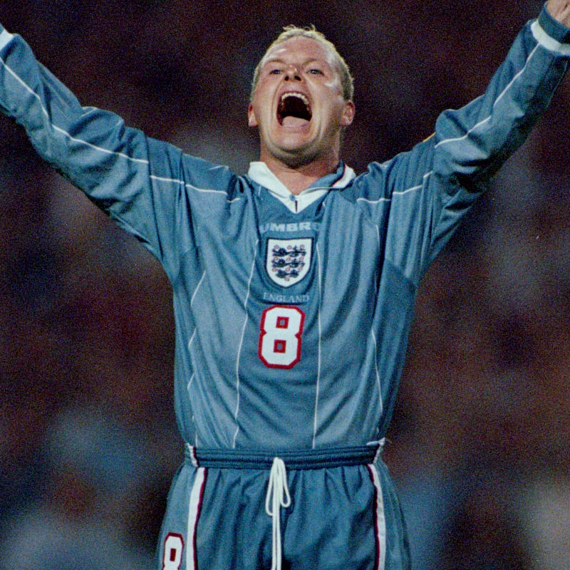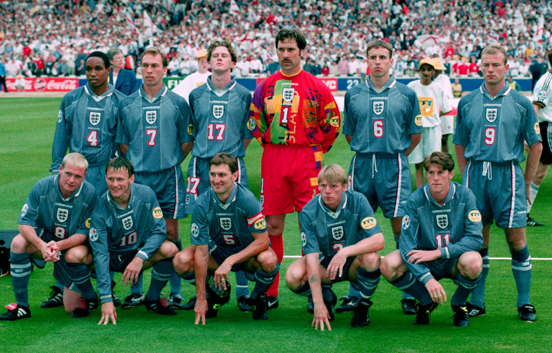 ポール・ガスコイン、アラン・シアラー、スティーヴ・マクマナマン、トニー・アダムス、テディ・シェリンガムといった選手が、このアウェイキットを着てドイツとの準決勝を戦った。