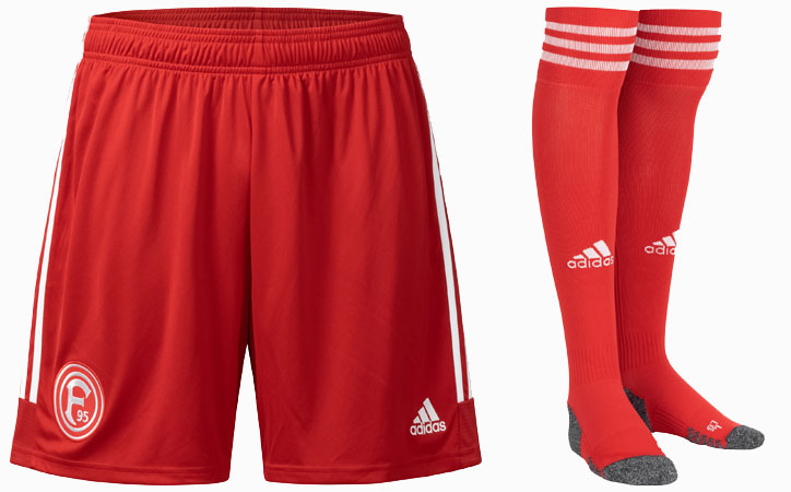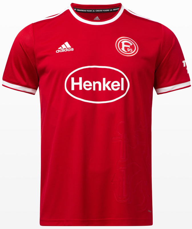 サプライヤーがuhlsportからadidasへ変更となった新シーズンのユニフォーム。ホームは伝統のレッドを基調としたデザインで、印象はこれまでと大きくは変わらない。前面にはデュッセルドルフ市の紋章をエンボスでプリントする。