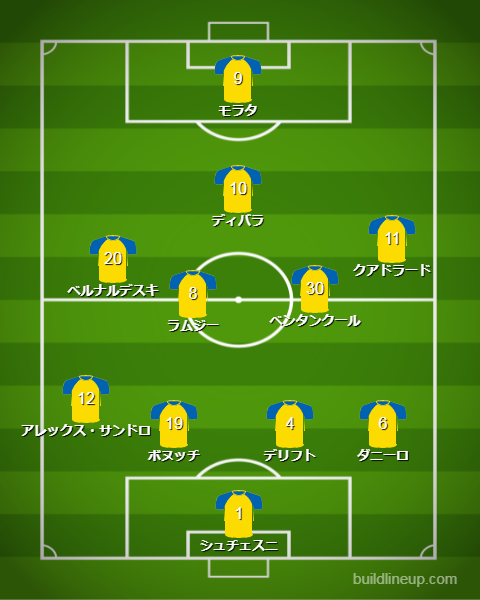 4-4-1-1のような形だが、守る時はダニーロが3バック気味になり、フアン・クアドラードが最終ラインに落ちてくることも。ジョルジョ・キエッリーニとロナウドらを投入した後半途中からは3バックになった。