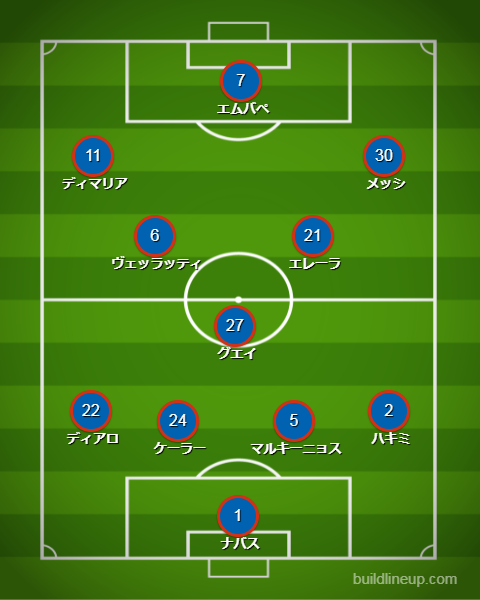 リーグアン第4節スタッド・ランス戦でベンチ入りすると、後半20分にネイマールとの交代でピッチに降臨。その際、フォーメーションはこのような感じだった。