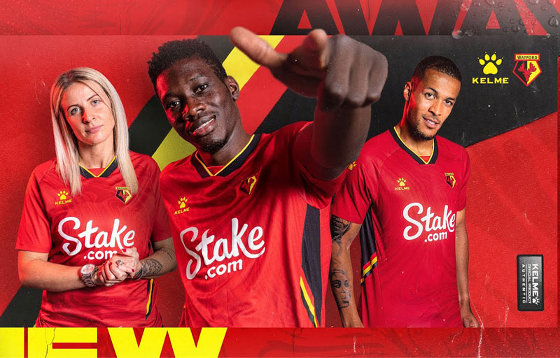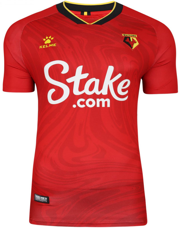 新アウェイユニフォームはレッドを基調とし、マーブル調のグラフィックが印象的なデザイン。襟部分には1stカラーのイエローとブラックのストライプを配する。胸スポンサーは今季からオンライン・ビットコインカジノの「Stake.com」に変更となった。