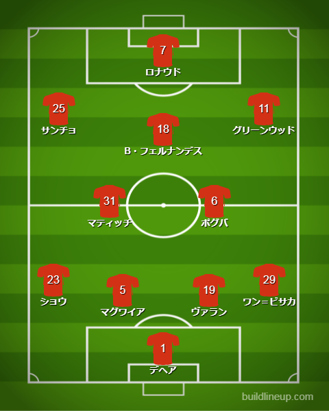 ロナウドをトップに置き、その下にブルーノ・フェルナンデス、そして、左右にサンチョとグリーンウッドという並び。