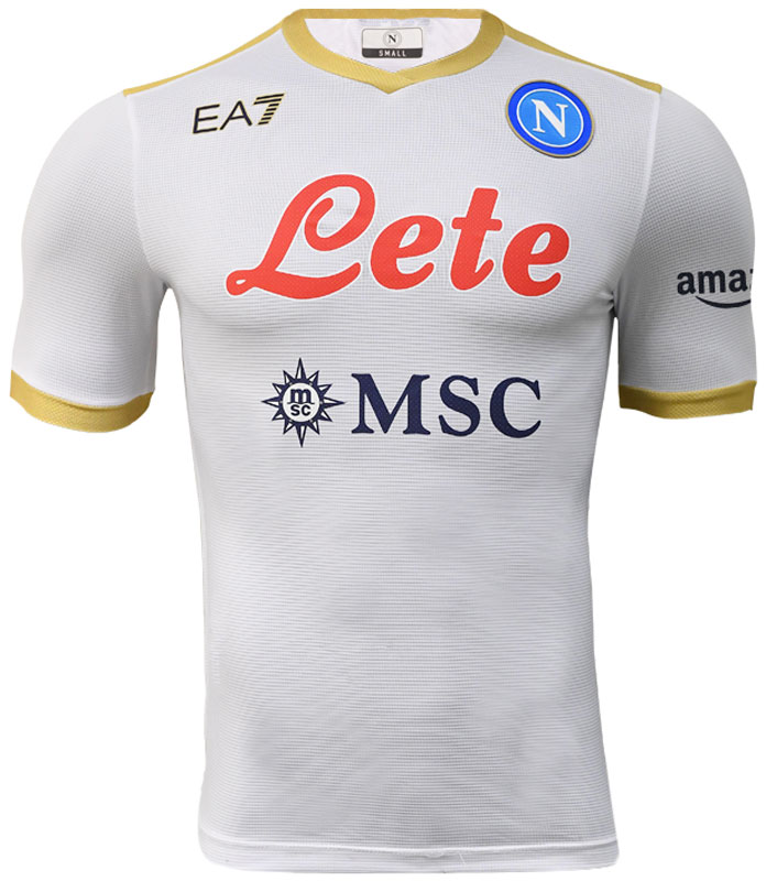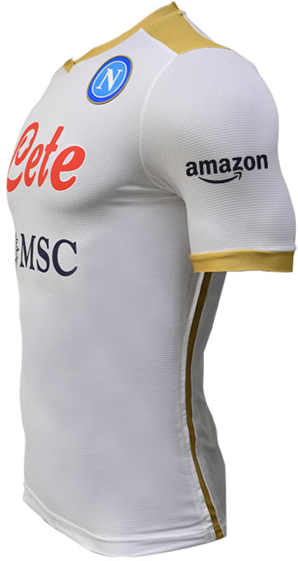アウェイはホワイトを基調にゴールドの差し色。胸スポンサーは「Lete」と「MSC」で継続だが、今季からは袖に「amazon」のスポンサーロゴを付ける。