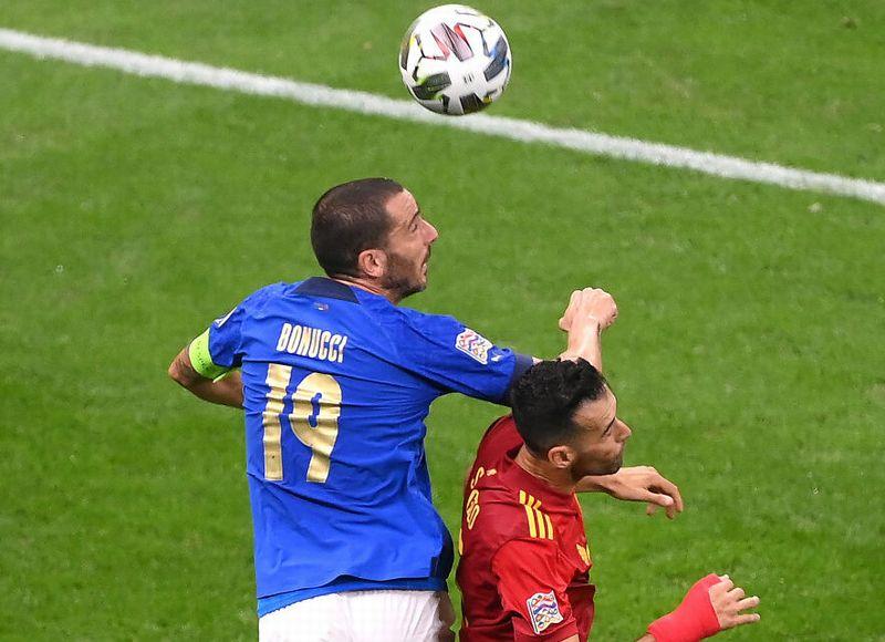 そして試合の流れを大きく左右したのは前半終了間際のプレー。イタリアのDFボヌッチが空中戦の競り合いでセルヒオ・ブスケツの顔に肘を当ててしまい、2枚めのイエローカードを受けて退場したのだ。
