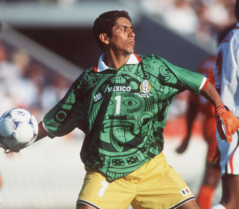 メキシコの遺物「太陽の石」をモチーフとした“アステカユニフォーム”。そのファーストモデルの登場はもっと早かったが、有名なのは1998年フランスW杯でのキットだろう。今でもベスト、ワースト両方に選ばれる稀有な一着である。