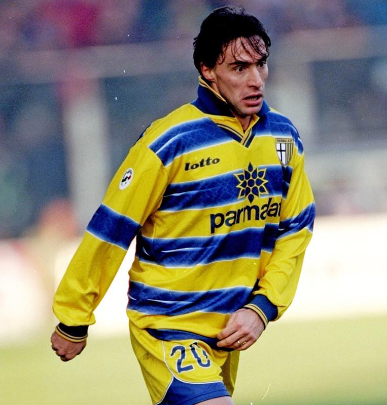 この時代のパルマは、ホームキットにジャッロブルー(黄と青)を採用していた。ブルーのボーダーは絞り染めのような“滲み”が特徴的。90年代のパルマと聞けば胸スポンサー「Parmalat」も一緒に思い出される。