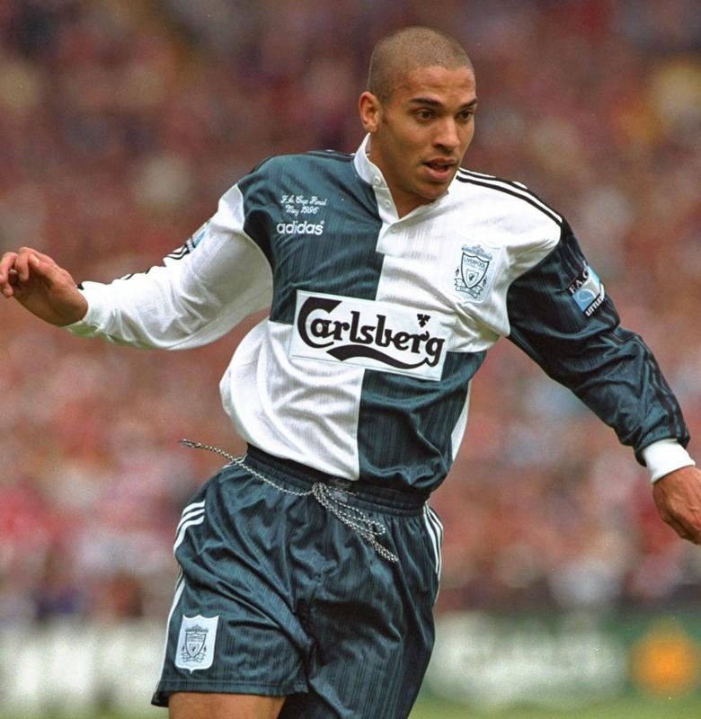 前adidas契約最終シーズンに登場した95-96アウェイキットは、異色の4分割デザインを採用。これは1890年代のキットデザインをモチーフにしたものだった。