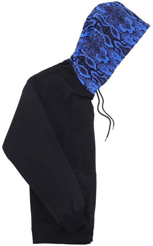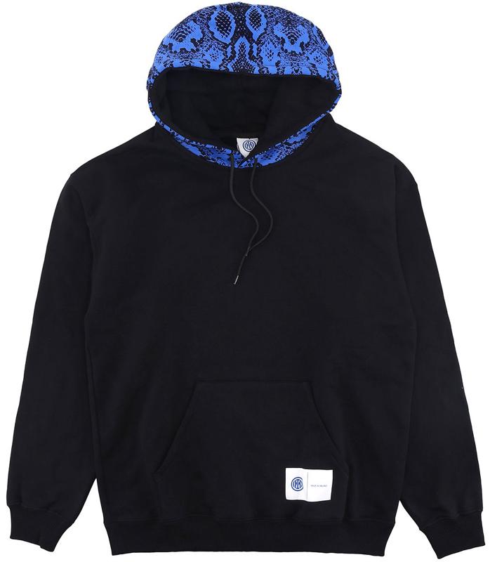 大胆にもフード全てをヘビ柄で覆うプルオーバーパーカーで、こちらは色違いのブラック。今回のコレクション全アイテムに、クラブエンブレムとブランド名入りのタブが付く。