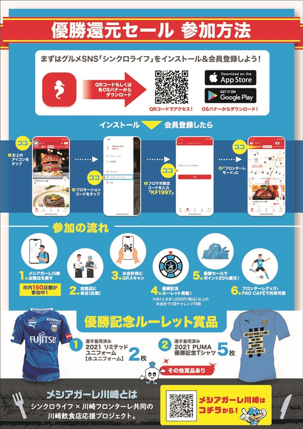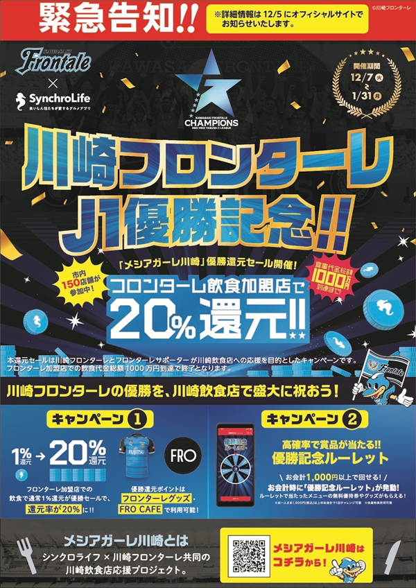 題して、J1優勝記念「メシアガーレ川崎 優勝還元セール」は、ファン・サポーターが川崎市内の飲食店を応援することを目的としたキャンペーン。