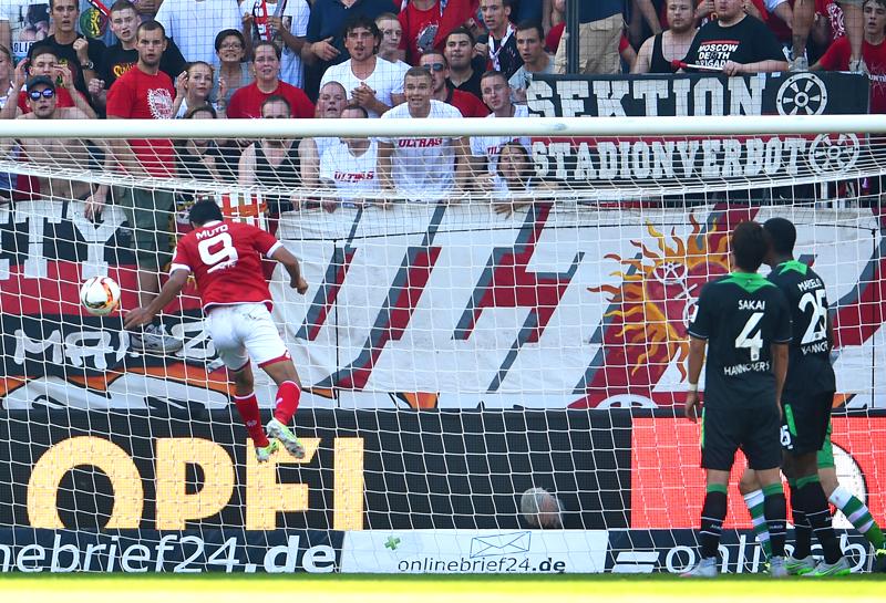 FC東京からマインツへ移籍した15-16シーズン。ブンデスリーガ初ゴールは第3節で、相手は酒井宏樹(浦和レッズ)が所属していたハノーファーだった。フリーの武藤が放つヘディングシュートを、酒井(4番)は見送る以外に為す術がない。