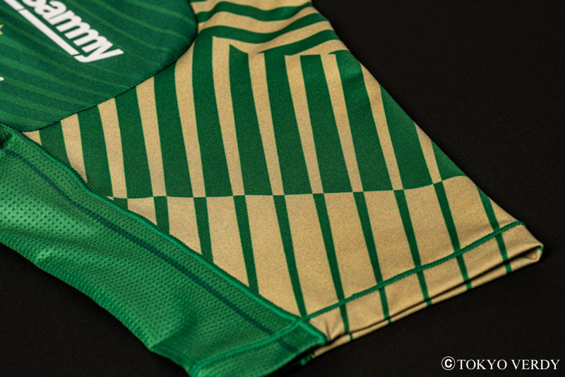 2022モデルの特徴ともいえるゴールドの袖。光線には微細なグリーンの粒子柄が散りばめられ、ヴェルディの拡がり・輝きを表現。