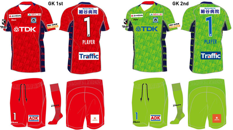 GKユニフォームは引き続きホームにレッド、アウェイにグリーンを採用。各キットの右袖にはホームタウンマーク「秋田県、秋田市、由利本荘市、にかほ市、 男鹿市」を付ける。