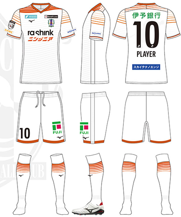 各部スポンサーは、胸に「ニンジニア」、背中上に「伊予銀行」、背中下に「スカイテクノエンジ」、左袖に「MIURA(三浦工業)」、鎖骨右に「HIKARI(ヒカリ)」、鎖骨左に「Benefit One(ベネフィット・ワン)」、パンツに「FUJI(フジ)」。