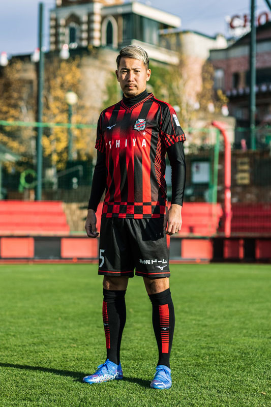 2022年も伝統のストライプを継承し、『赤と黒は我なり!』という誇りをイメージしたデザイン。エンブレムや胸の「ISHIYA」ロゴ部分などは、太い縦縞の中に細いグラデーションのシャドーストライプを使用してロゴを美しく配置する。