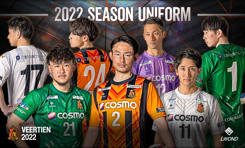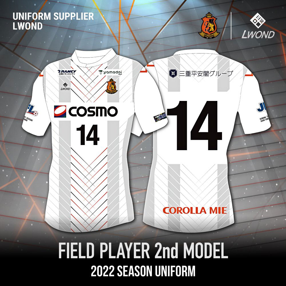 各部スポンサーは、胸に「コスモ石油」、背中上に「三重平安閣グループ」、背中下に「COROLLA MIE(トヨタカローラ三重)」、鎖骨右に「日本トランスシティ」、鎖骨左に「Yamadai(ヤマダイ食品)」、左袖に「旭興業」、パンツ前面に「四日市事務機センター」、パンツ背面に「三十三銀行」。