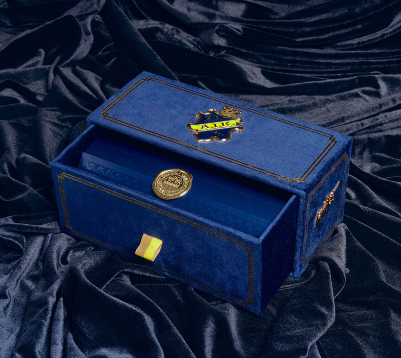 ユニフォームはブルーのロイヤルカラーをベースにした豪華で美しい装飾の特別ボックスに収納される。