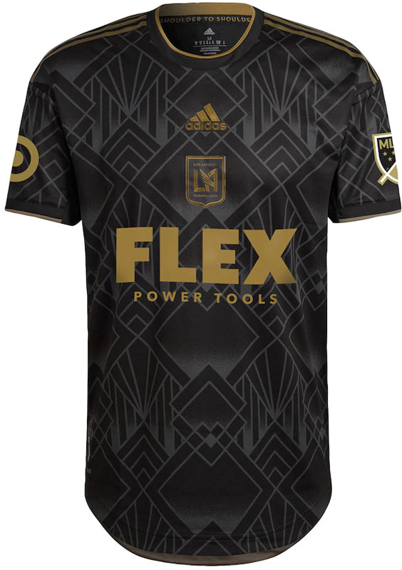 ブラックを基調にアールデコ調のグラフィックを散りばめた独特なデザイン。スポンサーロゴやメーカーロゴなど各部をゴールドで彩り、MLS参入5周年を華やかに祝う。
