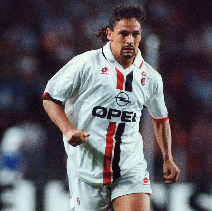 画像の選手はロベルト・バッジョ。オリジナルと今回のレトロジャージを見比べていると、小ぶりのエンブレムと、その上のステラ(星)のサイズ感もしっかりと再現しているのがわかる。