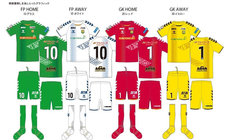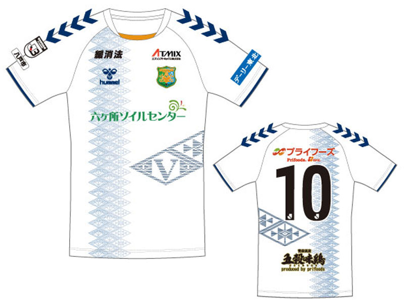 今季のデザインは、青森県南部地方に伝わる伝統工芸刺し子「南部菱刺し」をモチーフとしたもの。縁起が良い鳥の雉(きじ)の足模様、無病息災厄除けを意味する鱗紋、今回のユニフォームのためだけに作成した“必勝を意味するV模様”をデザインしている。各キット共通のデザインだが、とりわけアウェイキットは配色が美しい。