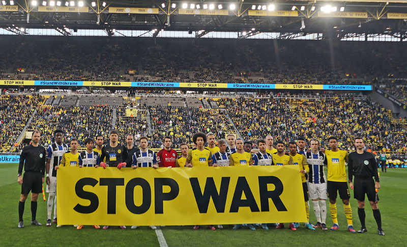 このユニフォームは13日にホームで行われたビーレフェルト戦で着用。腕のキャプテンアームバンドもウクライナ国旗カラーで、シャツと同じようにハッシュタグ“#StandWithUkraine”が入る。