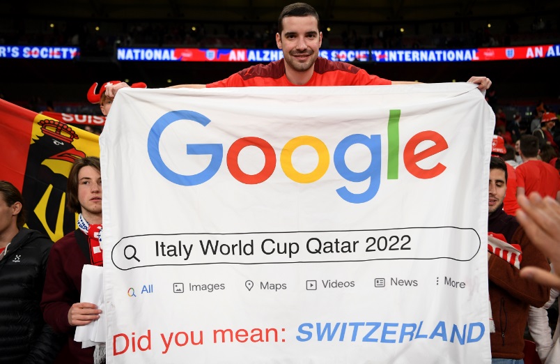 スイスサポーターが掲げていたのは、「Italy World Cup Qatar 2022でグーグル検索するとスイスになる」というような意味のバナー。これはなかなかの煽りだ…。