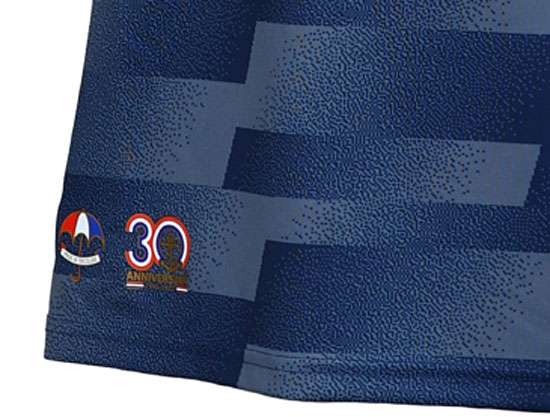 今季の通常ユニフォームと同様に、前面の裾部にはトリパラロゴと30周年記念ロゴを並べて配置する。