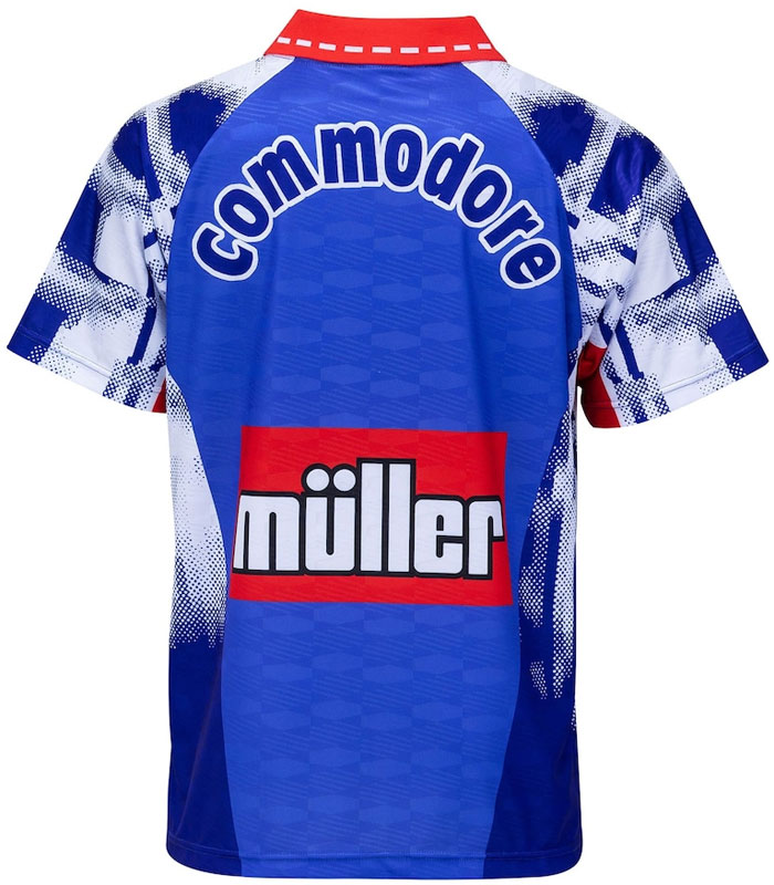 アウェイはホームと色違い的なデザイン。今回のヘリテージ・コレクションのシャツには全て、当時と同様に「Commodore(かつて存在したコンピューター企業)」、「Müller(乳製品企業)」のスポンサーロゴが付く。ちなみに当時の背番号は、上下スポンサーロゴの間に窮屈そうに配していた。