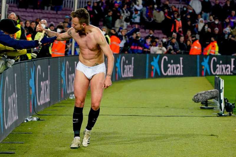 😅 Rakitic acaba en calzoncillos después de darle camiseta y pantalones a algunos aficionados de la grada de animación del Camp Nou. Ganó 13 títulos en Barcelona, jugador muy querido por los culés.@carrusel pic.twitter.com/vBlGLMuJ3u