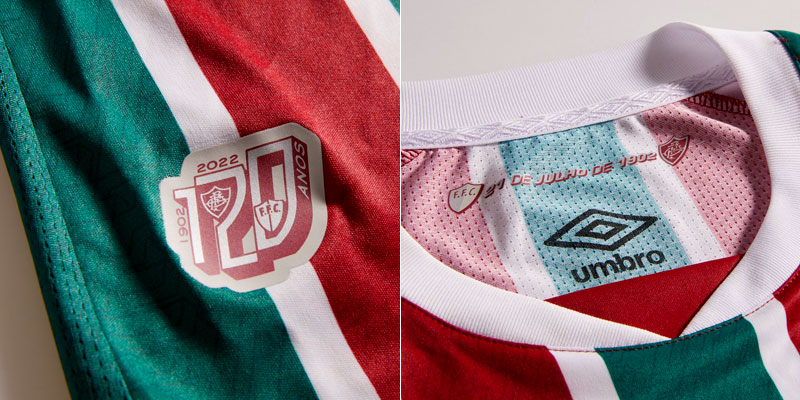 1902年7月21日に誕生したフルミネンセは、当初グレーとホワイトをメインカラーとして活動を開始。襟内側には、その2色の初代エンブレムも確認できる。前面右裾には120周年記念ロゴをプリント。
