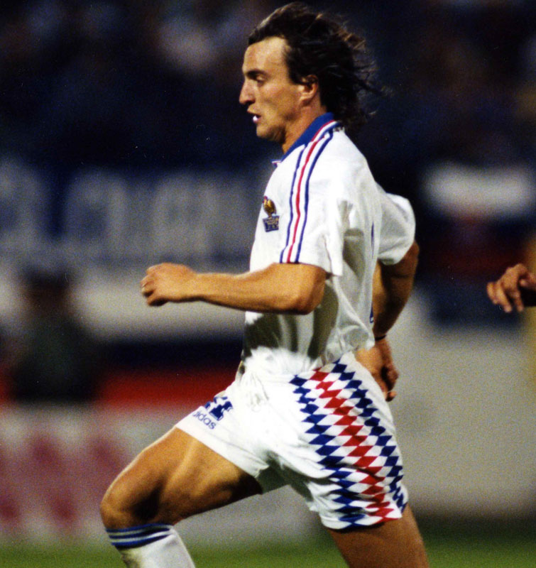 1994モデルのアウェイは基本的にホームの色違いだった。白を基調に赤と青のトリコロールカラーはホームよりも色鮮やかで、フランスらしいデザインだった。