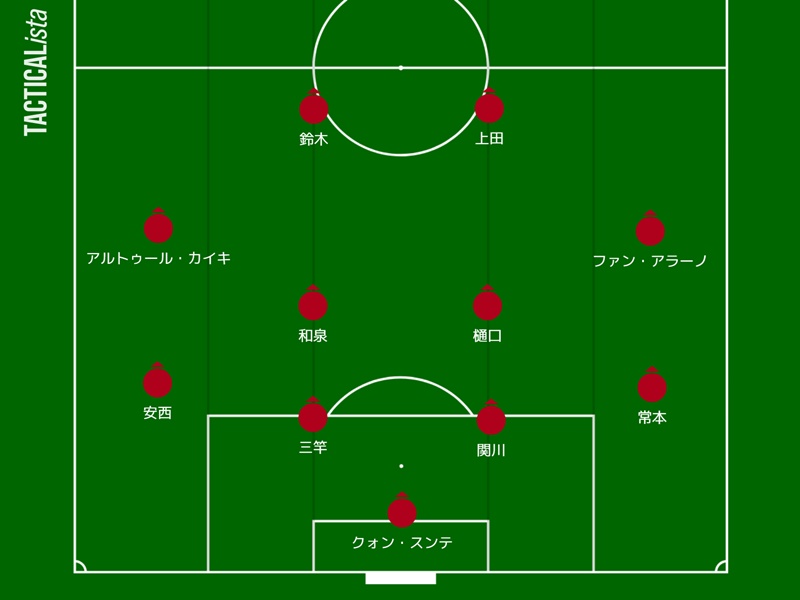 サイドハーフは右がファン・アラーノ、左はアルトゥール・カイキという技巧派がファーストチョイスだが、ほかにも土居聖真、荒木遼太郎、松村優太、仲間 隼斗らが控えており選手層は厚い。