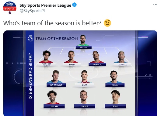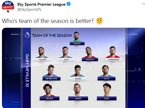 やはりシティとリヴァプール勢が多いが、韓国代表FWソン・フンミンも堂々の選出。MVPはキャラガーがデブライネ、ネヴィルはソンを指名している。