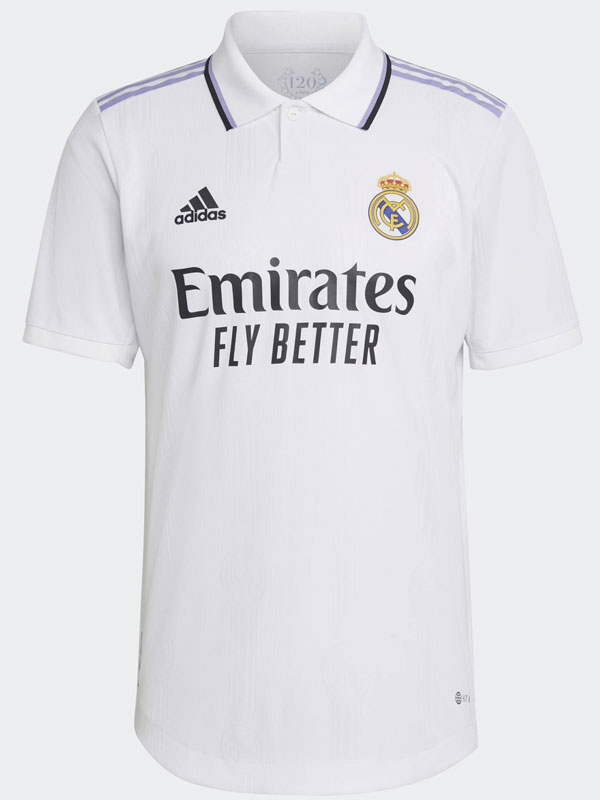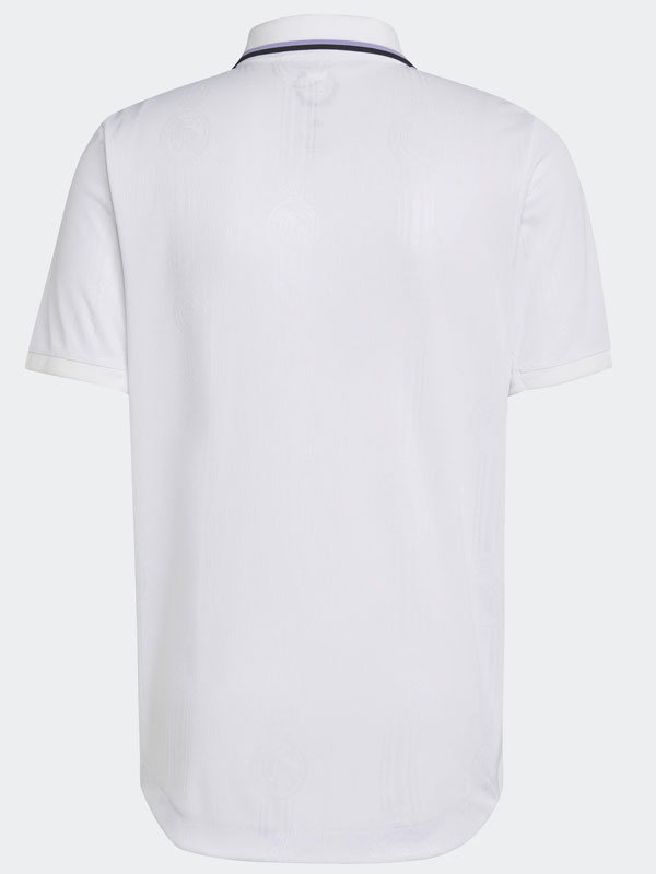 22-23新ホームキットは、伝統のホワイトを基調に淡いパープルを差し色に使ったエレガントなカラーコンビネーション。今回はポロ襟スタイルを採用し、クラブ創設120周年をクラシックなデザインで祝う。