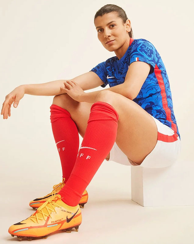 パンツはホワイト、ソックスはレッドを採用し、典型的なフランス代表のカラーコンビネーションに。シャツとパンツの脇部分にあしらったレッドのバンド部分には、チームの愛称“Les Bleues”をレタリングする。