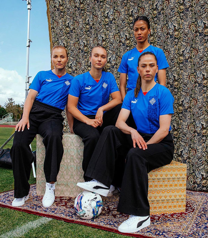 ユーロは4大会連続4回目の出場となるアイスランド。キットデザインは男子チーム用をベースとし、女子用は左のストライプ部分に花柄を落とし込む。