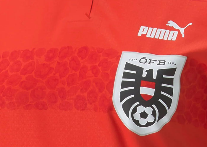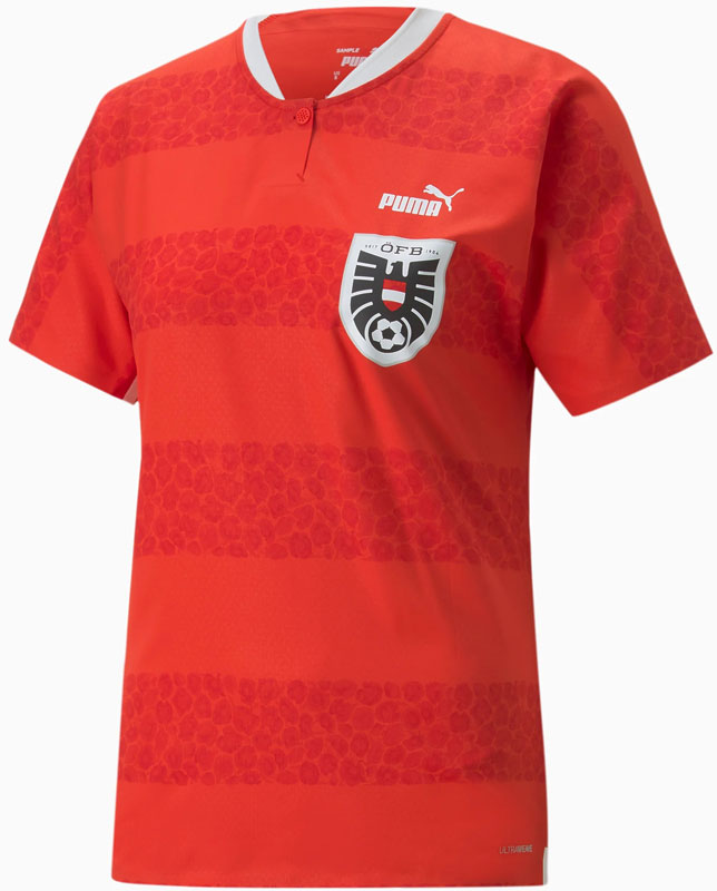 ユーロは2大会連続2回目の出場となるオーストリア。キットデザインは濃淡ストライプ(ボーダー)を採用し、その中に花柄を落とし込む。エンブレム上にPumaロゴを配する独特のスタイルも目を引く。