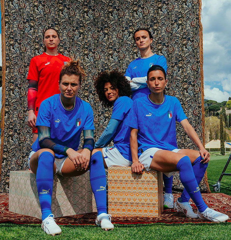 ユーロは7大会連続12回目の出場となる強豪イタリア。4分割のキットデザインは男子チームと共通で、右上と左下のブロックに花柄を描く。